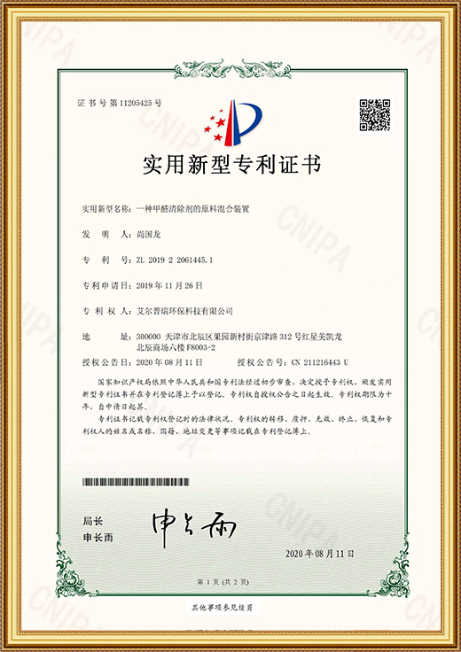 實(shí)用新型專利證書(shū)(一種甲醛清除劑的原料混合
